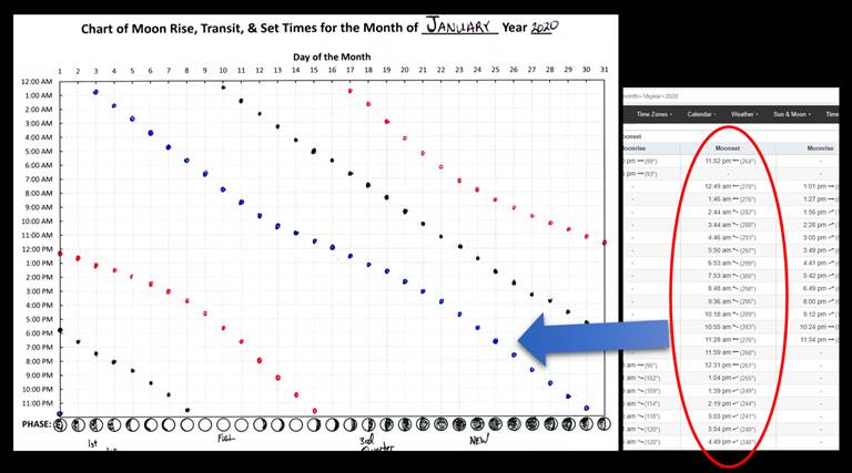 Lastly, connect the dots, and label the moon rise, moon transit/”meridian crossing” and moon set